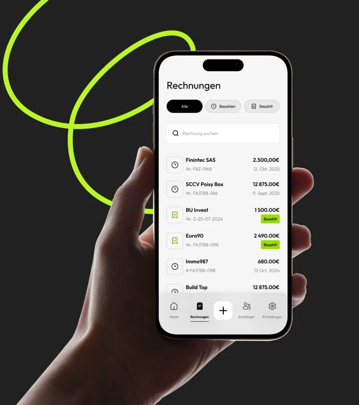 Mit einem Klick ist die Zahlung der Rechnung geplant — keine Erinnerung mehr, kein Jonglieren zwischen Plattformen und keine Angst vor vergessenen Zahlungen. Die Zahlung erfolgt automatisch zum exakt festgelegten Zeitpunkt, und die Rechnung wird in Ihren gesicherten Ordnern abgelegt, jederzeit abrufbereit.